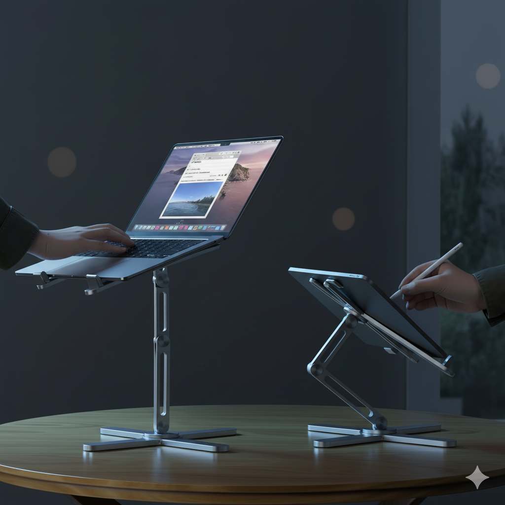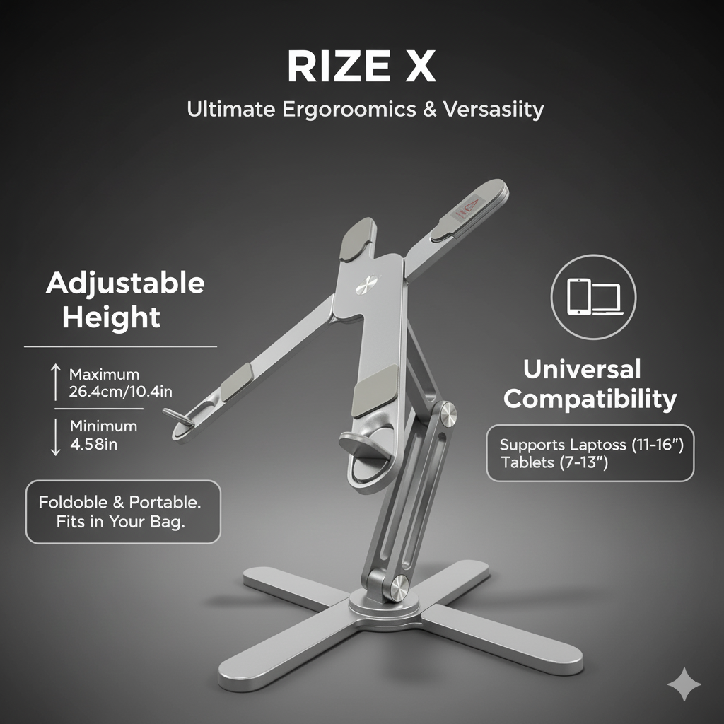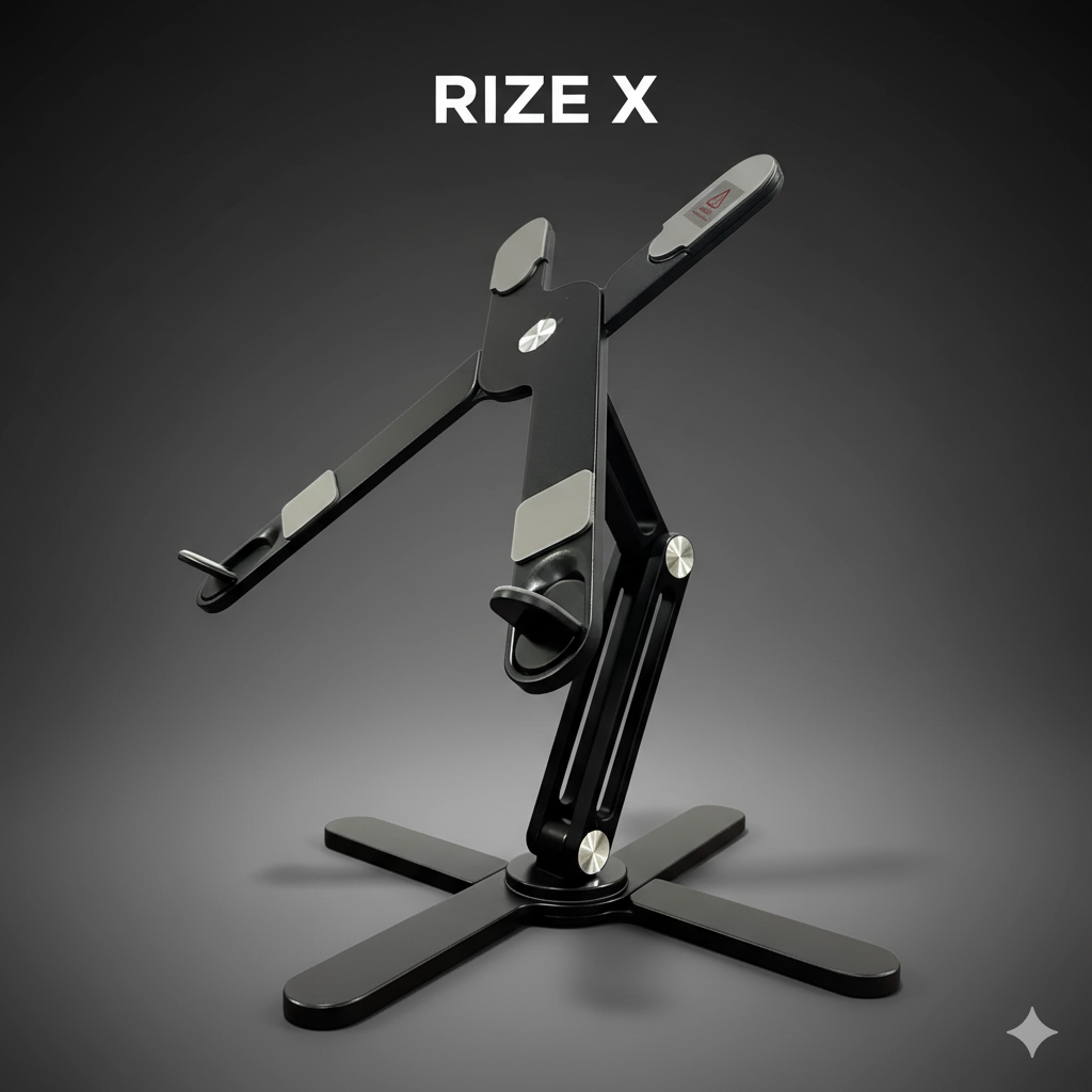 RIZE X is a premium, ultra-portable laptop stand built for creators, students, founders, and remote workers on the move. It lifts your laptop to eye level for better posture, stays rock-solid with aircraft-grade aluminium, and folds flat to disappear into any bag. Minimal, durable, and designed to elevate your workspace anywhere—from cafés to airports to home studios.